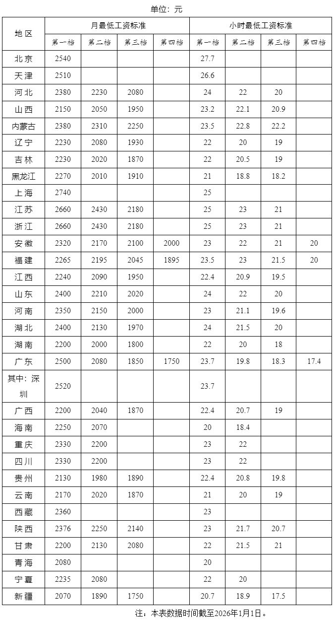 全国各省、自治区、直辖市最低工资标准情况(截至2026年1月1日)